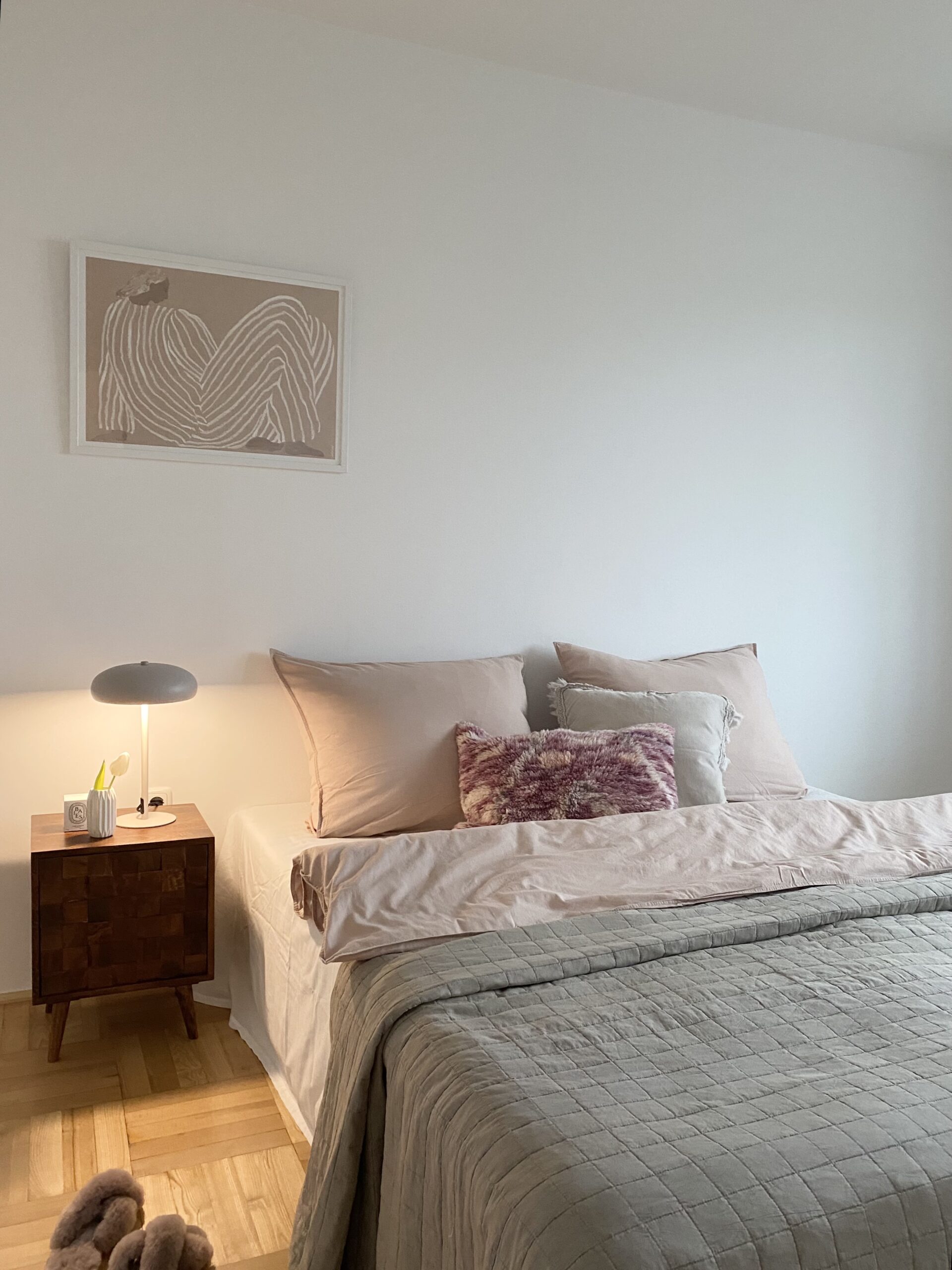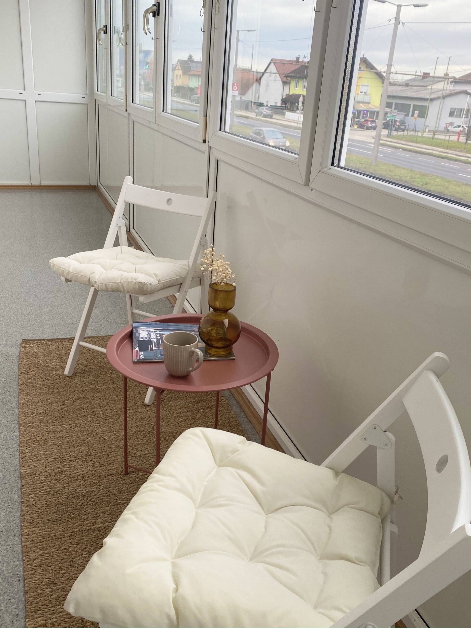 Über den großzügigen Vorraum welcher als Garderobe dient und ausreichend Platz bietet gelangt man in das Wohnzimmer mit direktem Zugang zur großen verglasten Loggia ca. 10m² wo man den Sonnenuntergang optimal genießen kann. Das Schlafzimmer bietet ausreichend Platz und Stauraum.