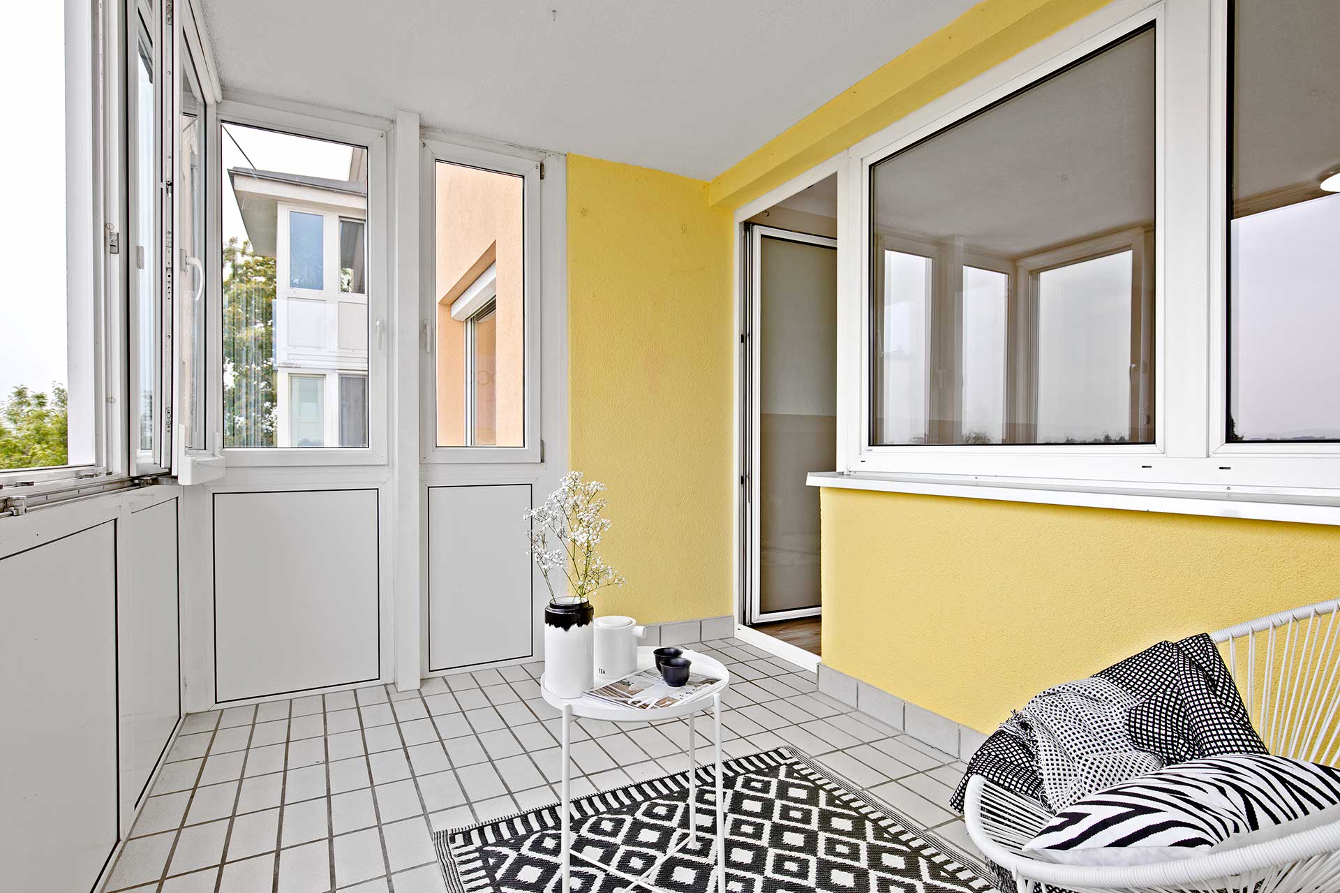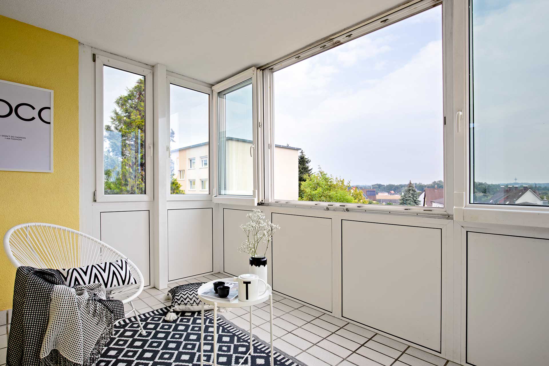 - Eine Überdachte und geschlossene Loggia mit 9,36 m2, die als Wintergarten genützt werden kann und die Fenster zur Gänze geöffnet werden können