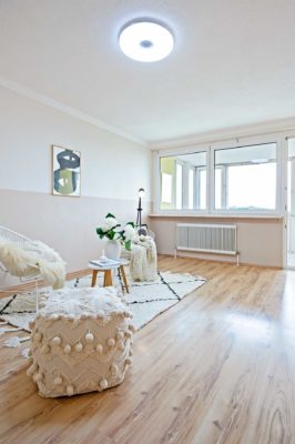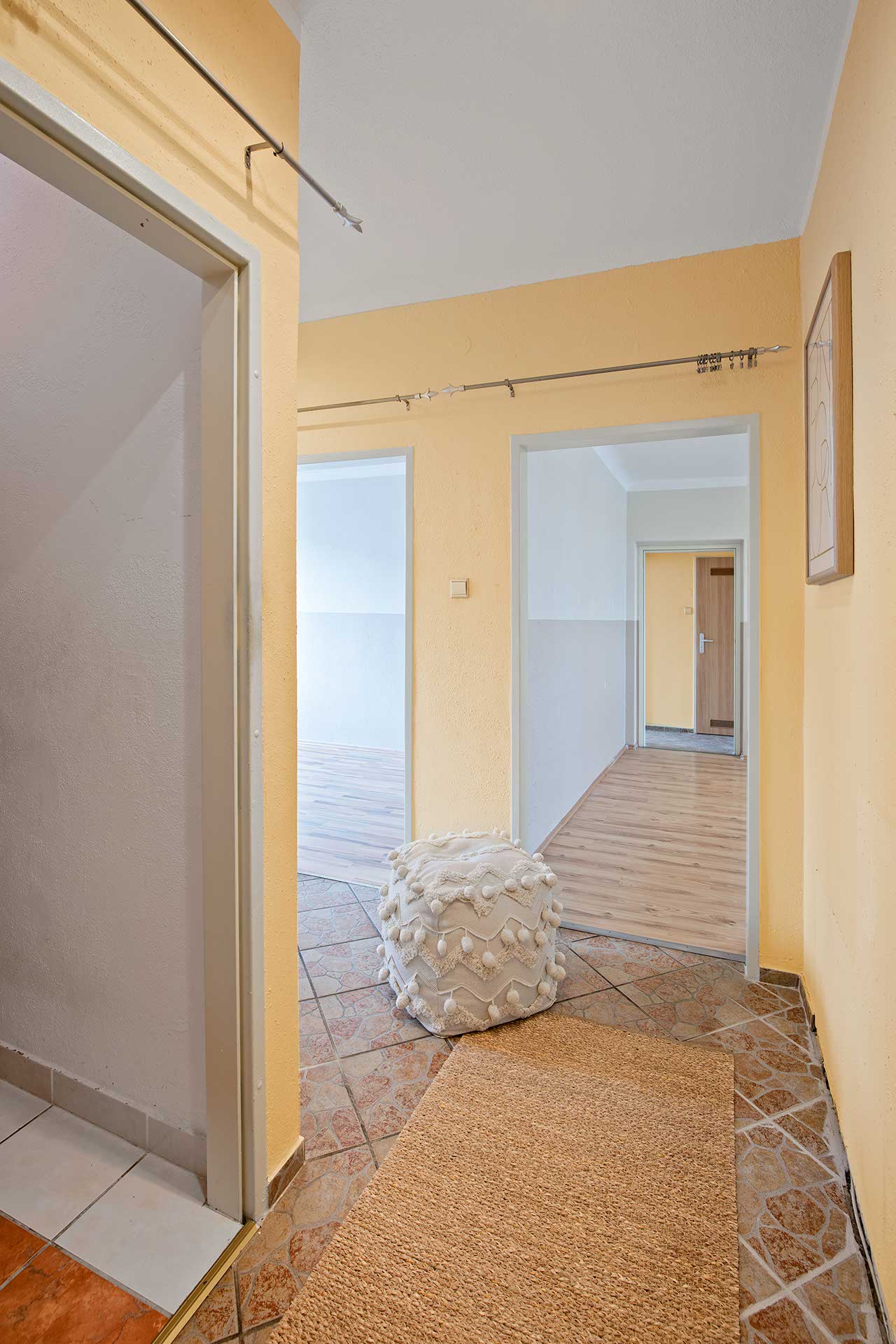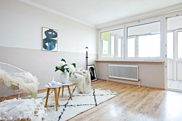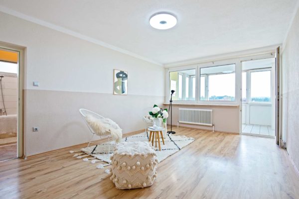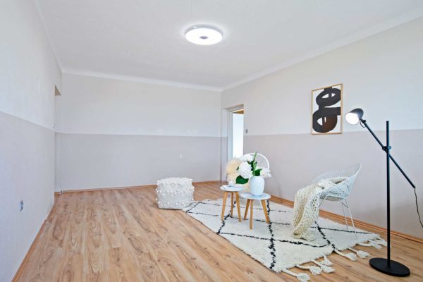Die Raumaufteilung gliedert sich in Vorraum, WC, Abstellraum, Küche, 2 Kinderzimmer, Wohnzimmer mit separater geschlossener Loggia, Elternschlafzimmer und renoviertes Badezimmer mit Badewanne, Waschmaschinenanschluss und Fenster zum Lüften.