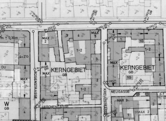 Bewilligt ist ein vollunterkellertes Wohn-Geschäftshaus mit 2 Stellplätzen im Freien und einem Spielplatz,