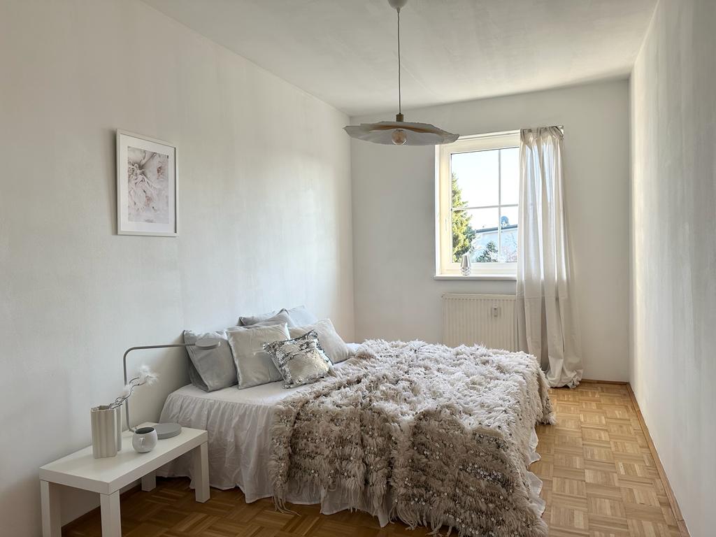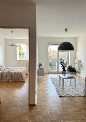 Durch die große Doppelflügeltüre und die optimale Ausrichtung nach Osten, kommt genügend Licht in die gesamte Wohnung. Mit einer liebevollen Renovierung könnte dieser Raum zu einem modernen und einladenden Ort umgestaltet werden.